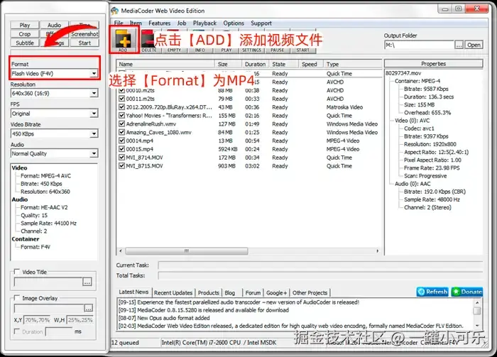 Media Coder Web Video Edition支持常用的视频格式转换,如MP4格式转换。下面是具体的操作步骤。