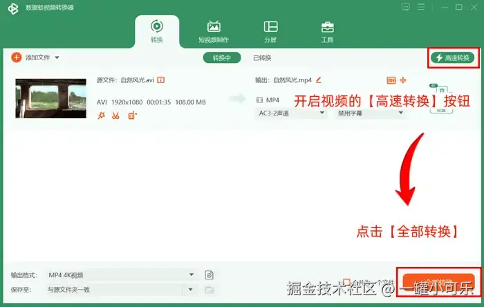 步骤3:开启视频的 【高速转换】 按钮,然后点击 【全部转换】 即可。