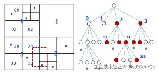 在查询时,使用r.mbr近似表示空间对象r,查找Quadtree中与r.mbr相交的节点,然后判断节点中的所有空间对象s是否与r存在空间相交关系。图1中,红色的矩形表示r.mbr,该矩形在Quadtree上遍历的节点标记为红色,然后找到叶子节点233上与其相交的一个空间点s,最后再判断r和s的相交关系。通过空间索引,可以快速过滤掉与查询框r.mbr不相交的节点,加快遍历查询效率。