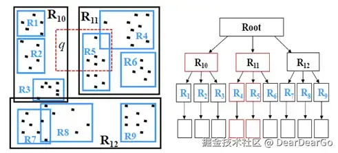 查询时,用r.mbr遍历树上所有与之相交的节点,然后摘取节点上的空间点s并判断r与s是否空间相交。在图2中,红色矩形表示r.mbr,它在KDtree上遍历的节点用红色标记。