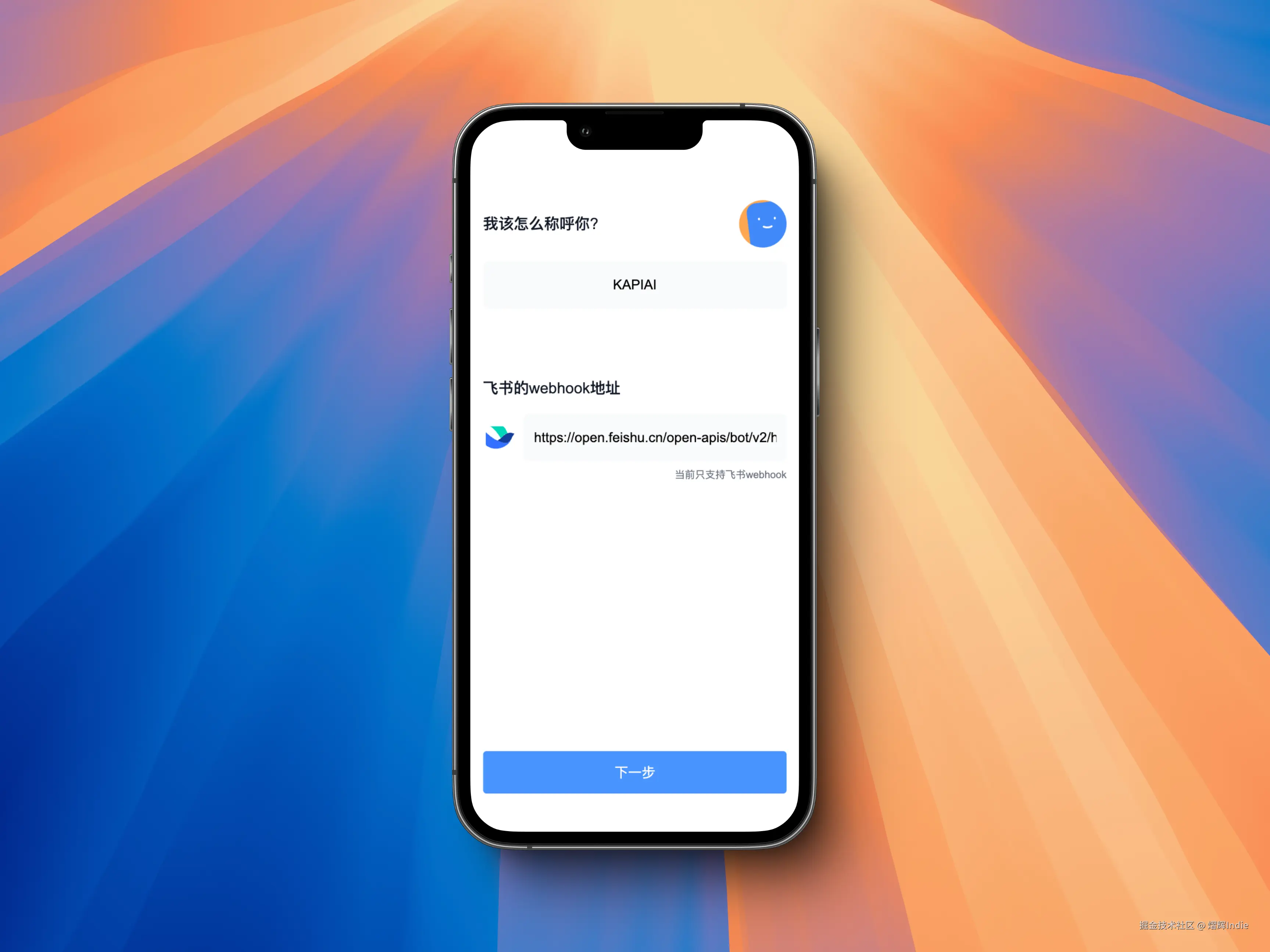 新用户首次进入时,输入昵称和飞书的webhook链接。webhook链接对应的是发送到飞书消息的地址。