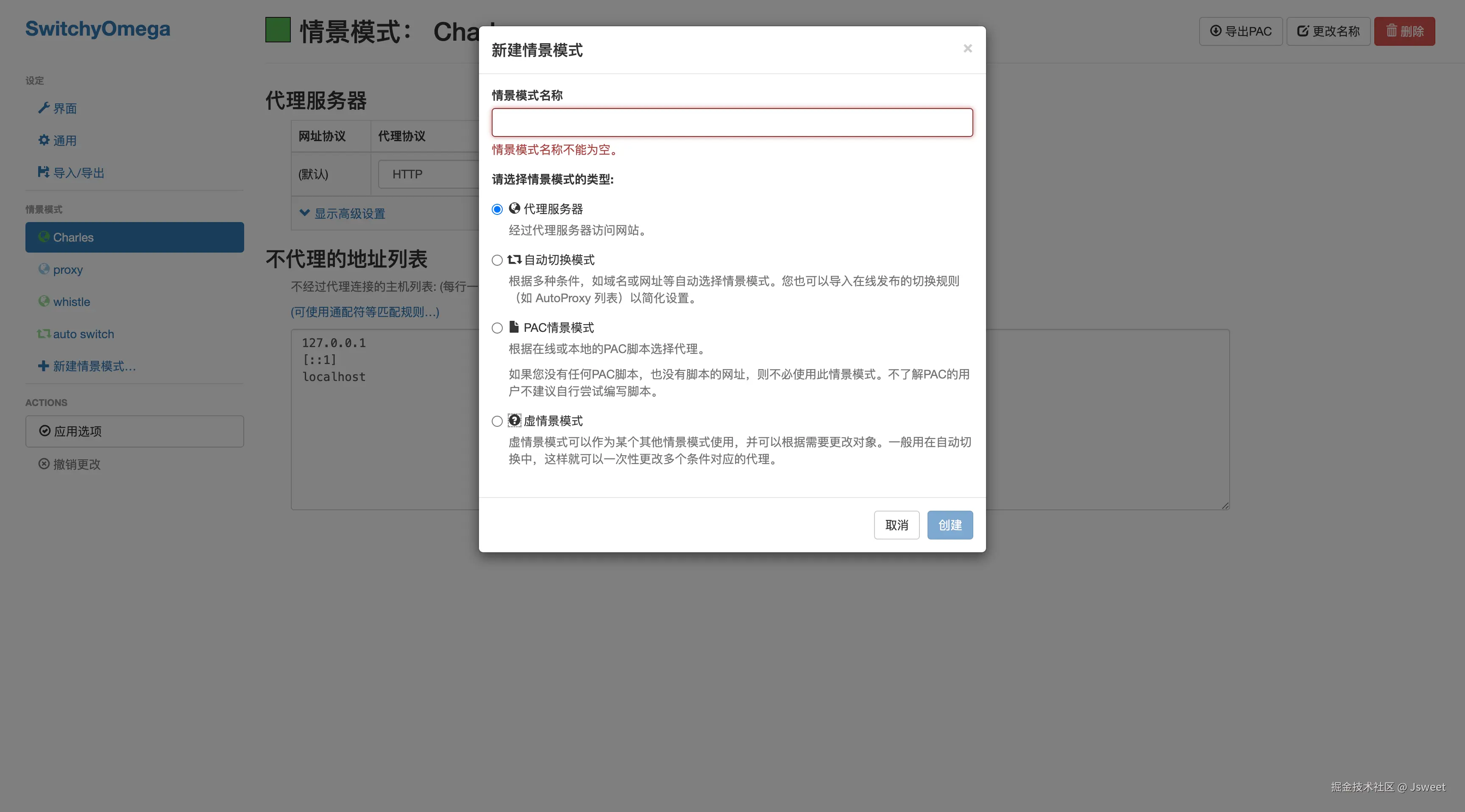 SwitchyOmega- 新建代理情景,名字随意,但是为了区分标识,一般用 whistle