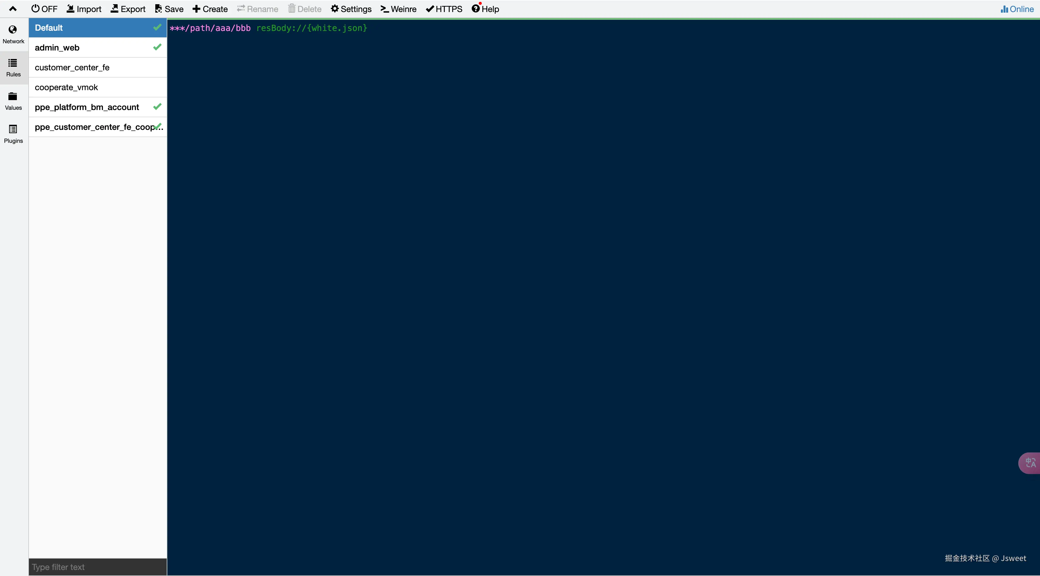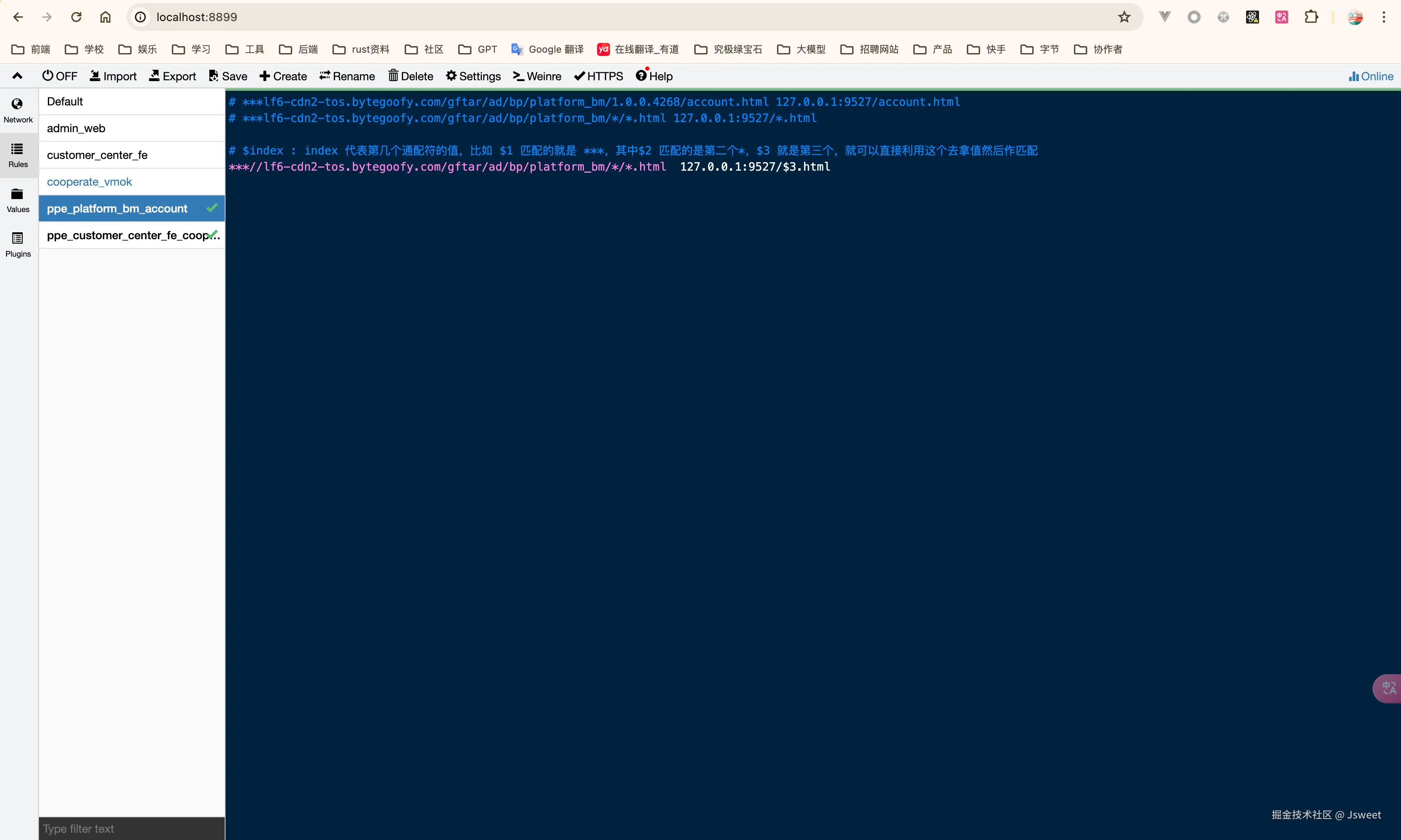 所谓服务代理,就是当我在本地启动一个前端项目的时候,我们的项目一般都是运行在本地端口。有时候我们可以需要使用一些线上/验收/测试环境的登陆信息,希望在访问这些域名的时候,将服务打到本地端口上,便于开发调试。此时就可以去 Rules 里进行配置。