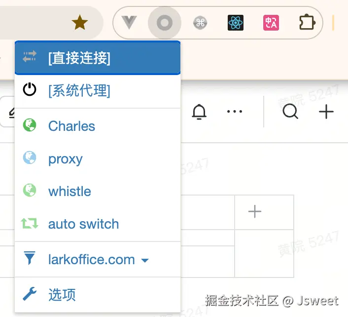 - 再到对应网站切换即可,切换到 whistle 即使用 whistle 的代理,切换直接连接,即关闭代理。