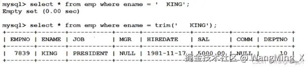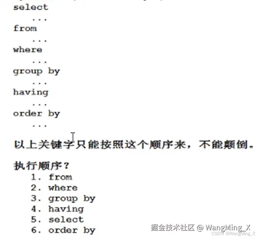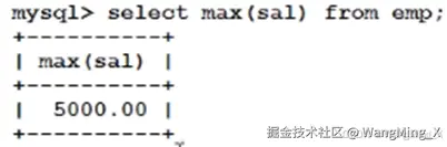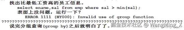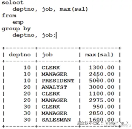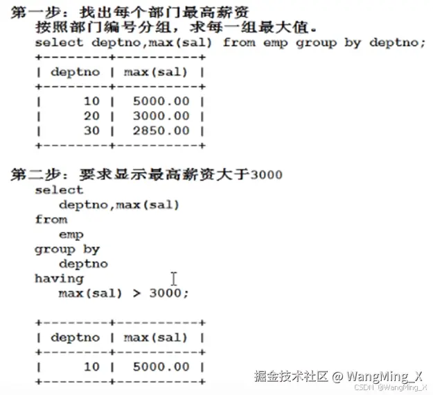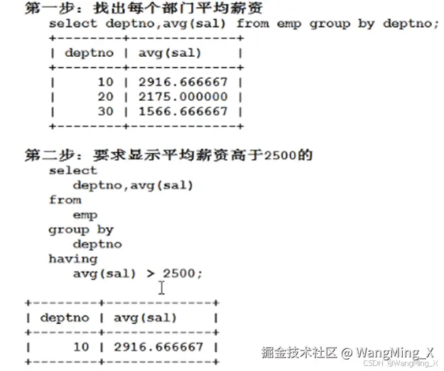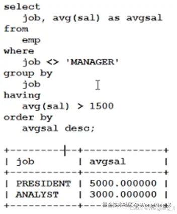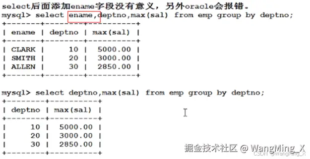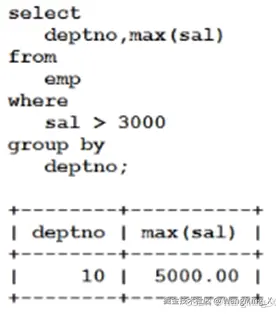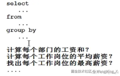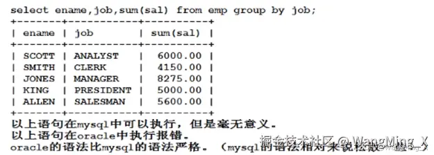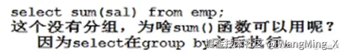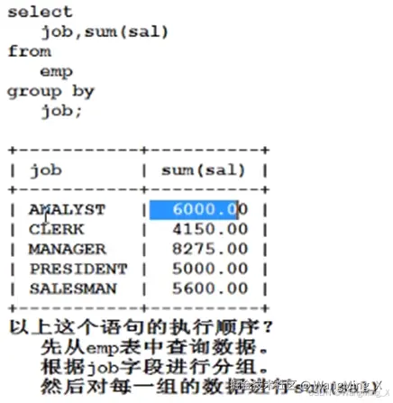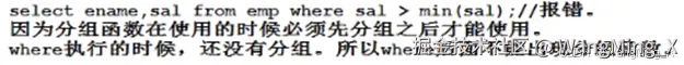 - 在一条select语句当中,如果有group by语句的话,select后面只能跟:参加分组的字段,以及分组函数。