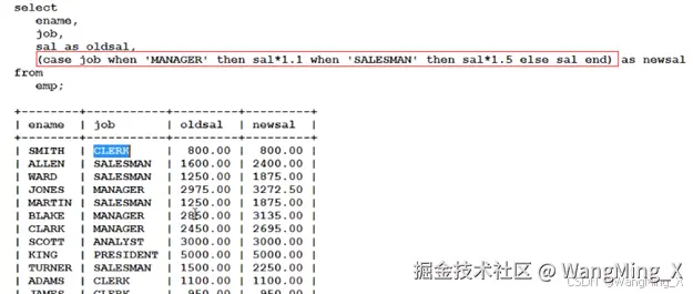 - 当员工的工作岗位是MANAGER的时候,工资上调10%,当工作岗位是SALESMAN的时候,工资上调50%,其它正常。(注意:不修改数据库,只是将查询结果显示为工资上调)