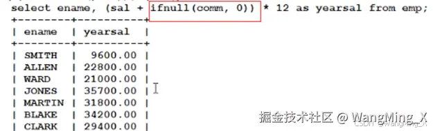 - 注意:NULL只要参与运算,最终结果一定是NULL。为了避免这个现象,需要使用ifnul1函数,ifnul1函数用法:1fnul1(数据.被当做哪个借)