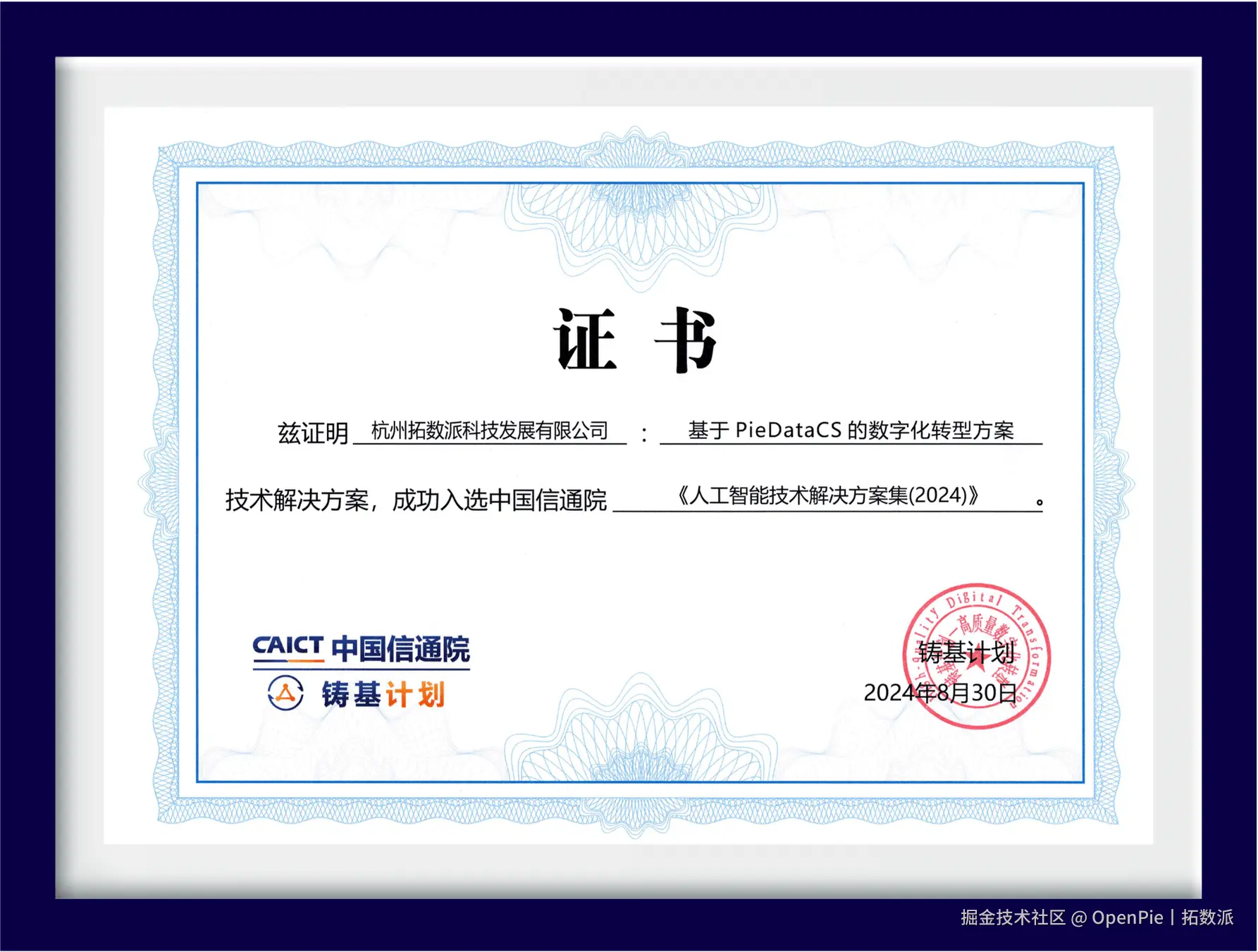 与此同时,拓数派凭借行业内优异表现,其基于 PieDataCS 的数字化转型方案成功入选 2024《人工智能技术解决方案集》(以下简称“方案集”)。