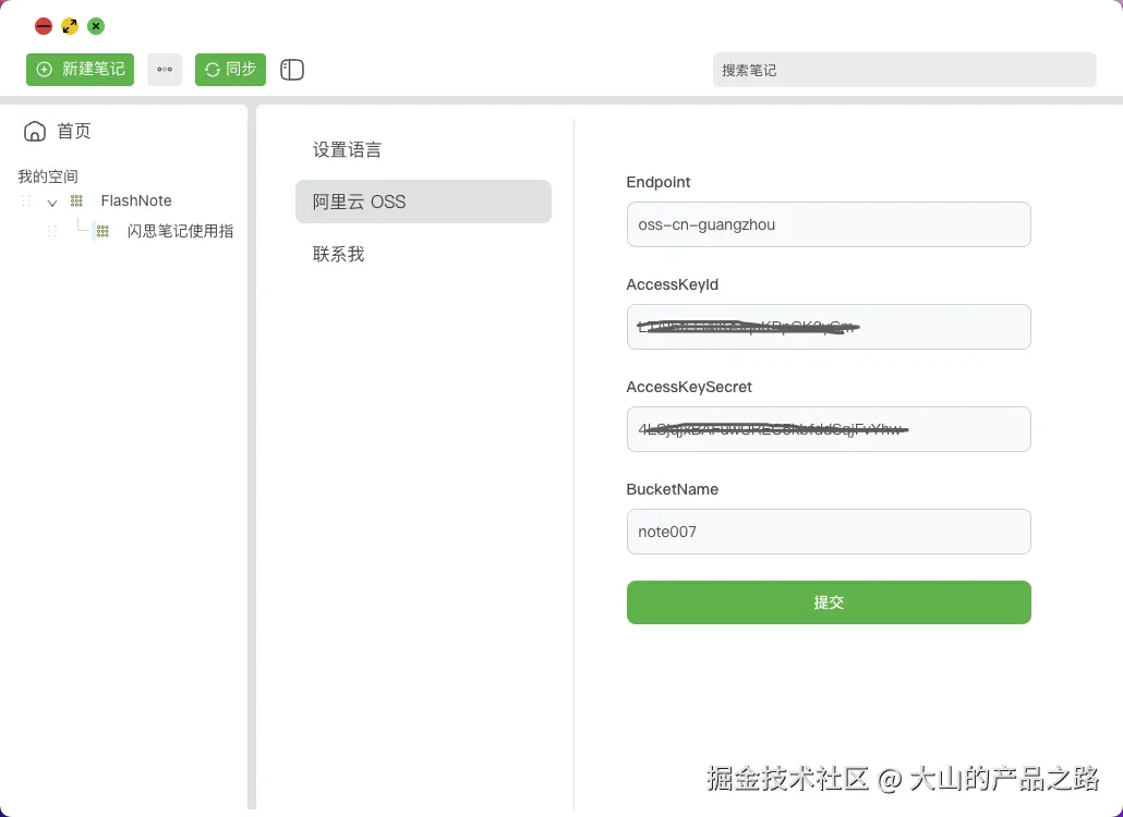 在设置中 配置 OSS,成功后重启应用,笔记同步就完成了。
