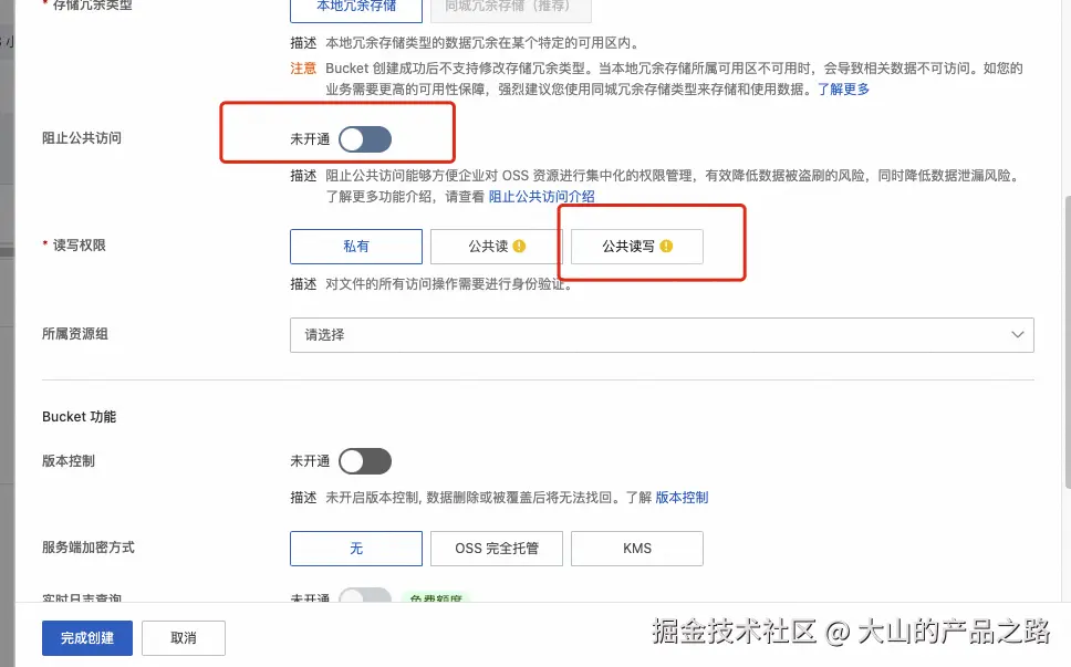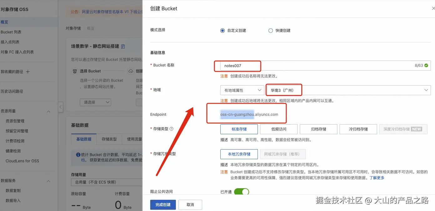 创建 BUcket,填写信息 并且复制 Endpoint ,读写权限,该为公共