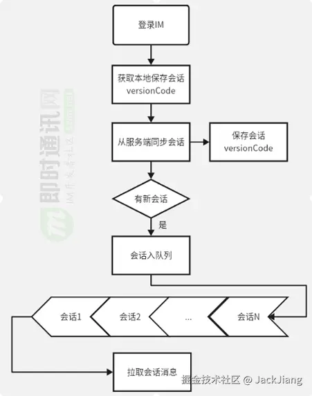 **问题解决:(会话拉取versionCode机制+消息拉取队列):**针对以上背景,优化的核心主要是在业务逻辑上减少IM登录到IM同步期间的服务端请求。