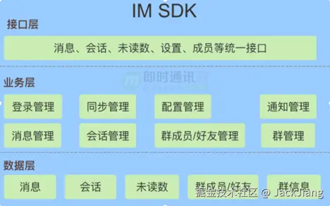 Android IM SDK整体由公共接口层、业务层和数据层组成,其中: