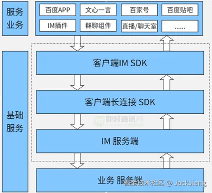 基础服务层主要由公共IM系统中客户端IM套件、服务端IM服务,以及业务自己服务端组成。