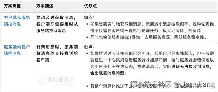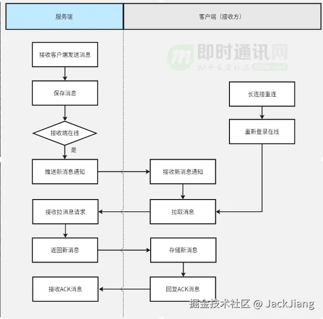 - 2) 如果服务端推送下行通知消息时,接收方长连接服务处于不可用/不稳定的情况,端需要增加长连接连接状态监测,重连拉取机制;监测到长连接重新连接后,主动重新拉取服务不可用时刻之后的消息,保障用户能够及时看到离线期间漏掉的消息。
