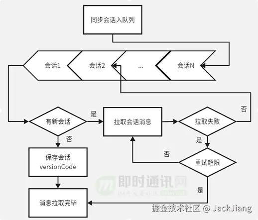 2) 客户端每次同步会话时,将所有新会话放入同步队列中,防止每个会话开一个线程,增加客户端线程池饱和风险,减少服务端并发请求。
