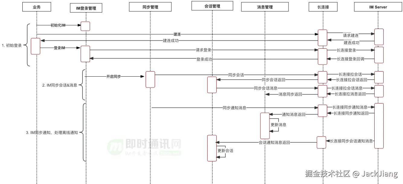 - 2) 同步管理:负责在IM登录后同步单聊、群聊会话,消息、通知消息等账号内相关数据;