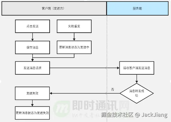 IM SDK发送上行请求,长连接因为网络或其他原因导致长连接服务不可用、服务端服务异常时,消息发送失败,需要对发送失败的消息做标记,UI上提供视觉展示,增加重新发送机制,在交互上避免用户发消息失败时出现消息已发送对方收不到的错误预期,提高服务恢复时功能可用性。