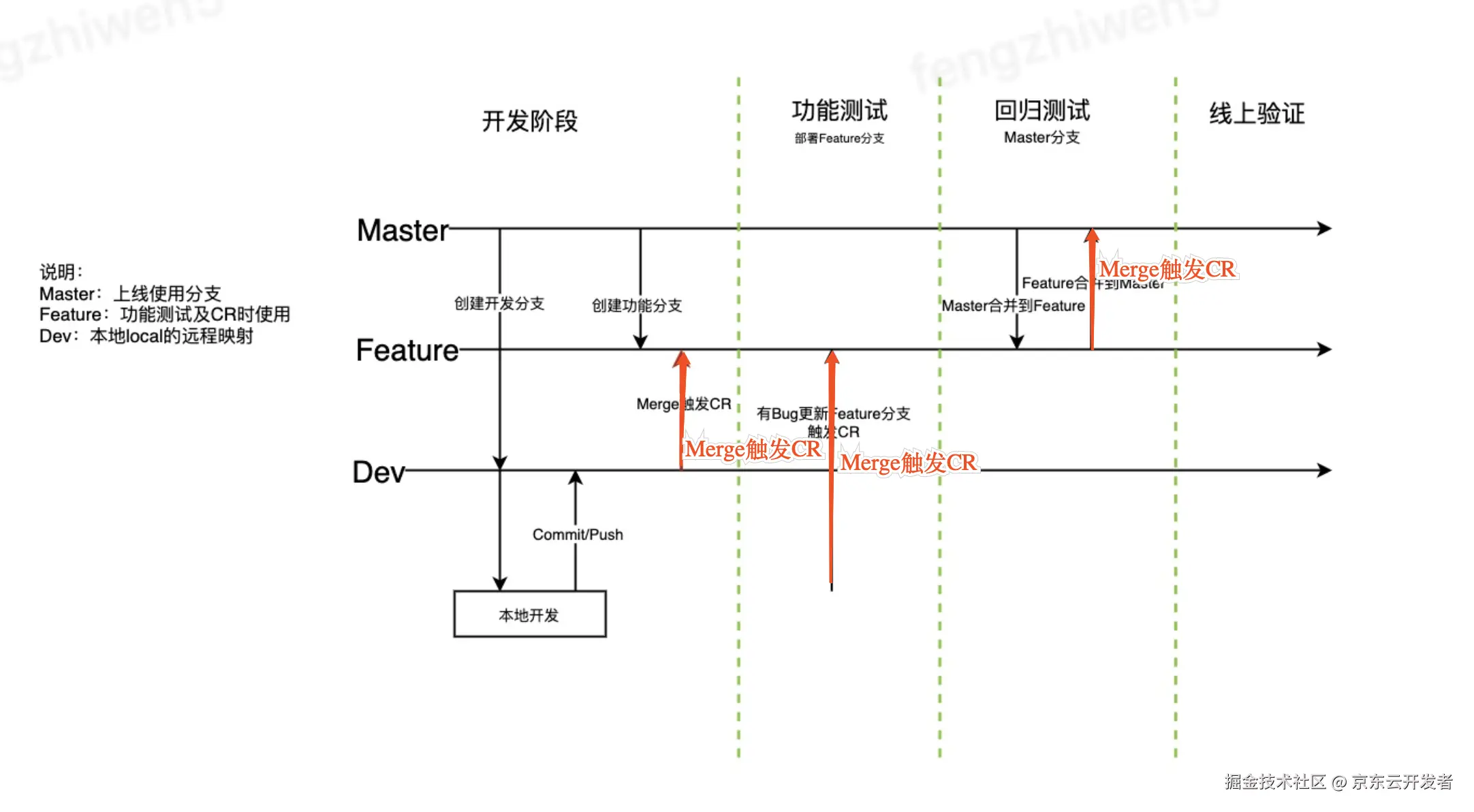 备注:Dev分支主要作用local代码库的远程备份,这个备份动作是通过不断commit&push完成,所以不用担心代码丢失。Feature分支承担功能测试和CR的作用,因为有Dev一层屏蔽了中途反复地修改,使得提交地PR更为清晰。Master是上线使用的分支。