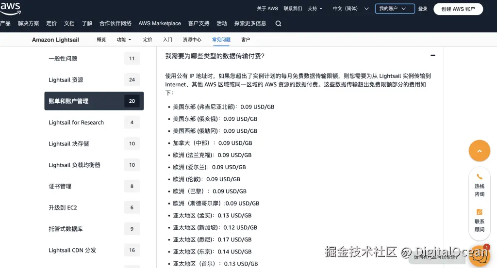 从价格上来讲,Linux 版本的会更便宜。从配置上来讲,Lightsail 确实提供了较高的免费出站流量,不过超出额度的话,需要收取的流量费用也是比较高的。在这里要说明的是,AWS 的出站数据传输费用是根据地区而定的,不同地区价格不同,具体如下图。