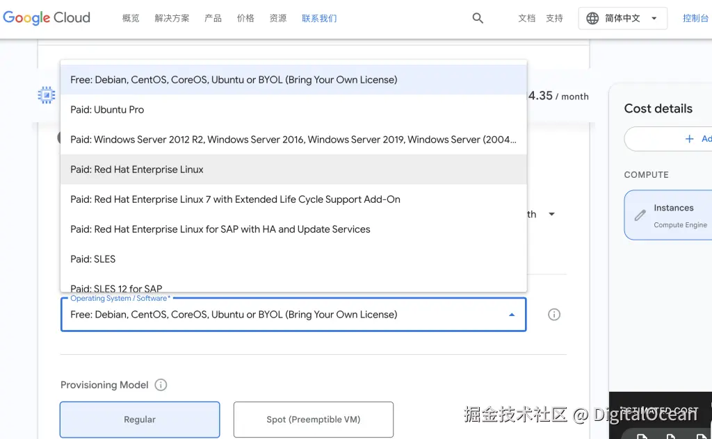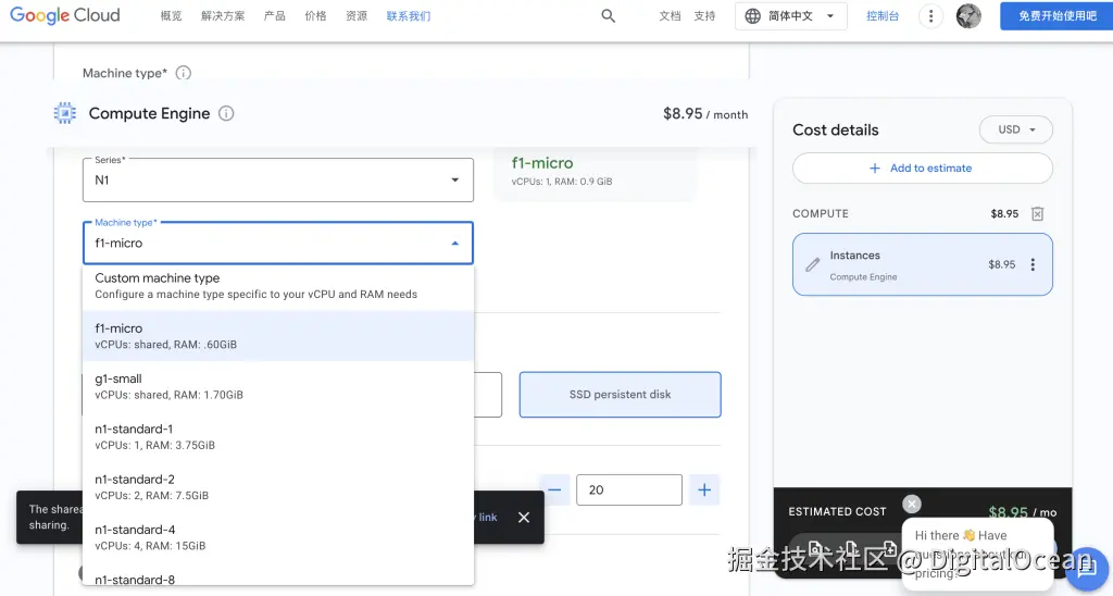 另外,如果你不满足于 1 vCPU、0.9 GiB RAM的配置,那么就需要选择其它机型。但其它机型就不再有免费的出站流量了,而且价格会更高一些。