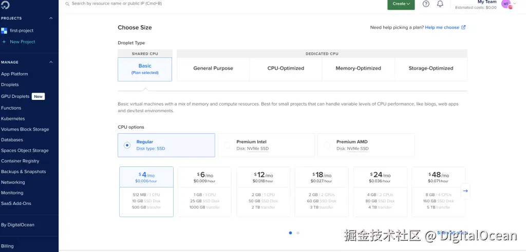 如果你需要更好的性能,在 Basic Plan 中,还可以选择高级 CPU 机型(Premium Intel/AMD)。在上文的表格中,我们选择的就是 Premium Intel 机型。尽管与 Lightsail 一样是 8 核的配置,但是Droplet 使用的 CPU 是较新一代的 Intel 芯片。而且,在相近的价格下,Droplet 还会提供比 Lightsail 更多的免费流量。