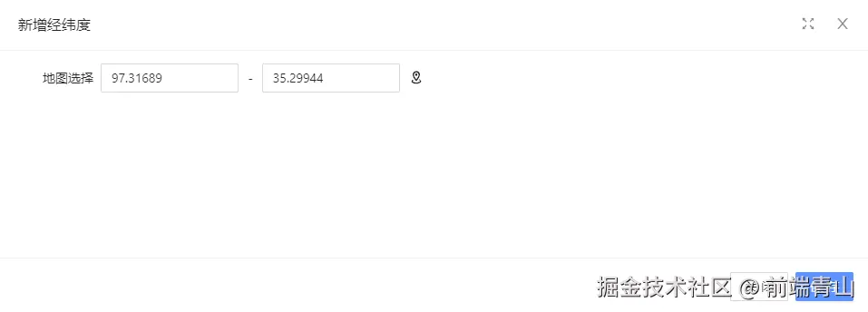 <FormItemRest>是一个表单项容器组件;<MapModal>是一个地图模态框组件,通过v-model:value绑定到location属性,表示地图选择的地理位置,@success事件在选择成功时触发,:initial-longitude和:initial-latitude分别绑定到location.longitude和location.latitude,表示地图的初始经度和纬度;<a-input>是一个输入框组件,通过v-model:value绑定到location.longitude和location.latitude,表示经度和纬度的值,readonly和:disabled表示输入框为只读且不可用状态,:placeholder表示占位符,:size和:bordered分别表示输入框的大小和边框样式,@blur表示输入框失去焦点时触发的事件;<Icon>是一个图标组件,显示一个地图标记的图标。