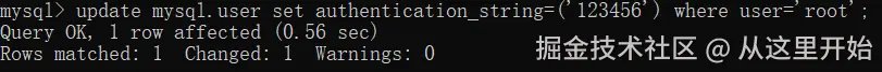mysql> update mysql.user set authentication_string=("123456") where user="root";