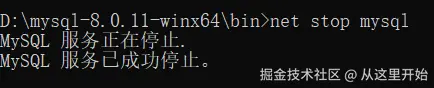 1、打开cmd,切换到mysql的bin目录下,输入命令net stop mysql,停止mysql服务;