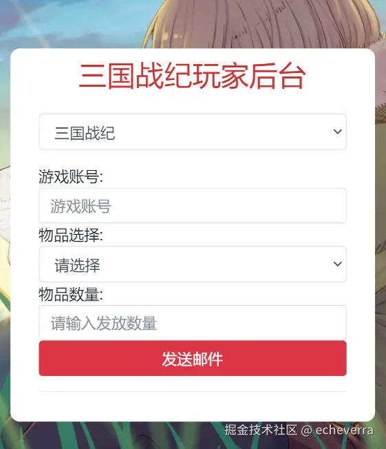 授权成功后打开玩家 GM 后台:http://IP:81/gm/player.php,填写账号,发送指定物品即可,游戏需要刷新重新进入,在邮件中领取。