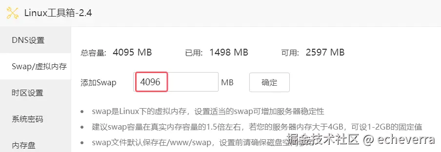 如果内存是 2G 可以先设置虚拟内存,使用 Linux 工具箱添加 Swap。