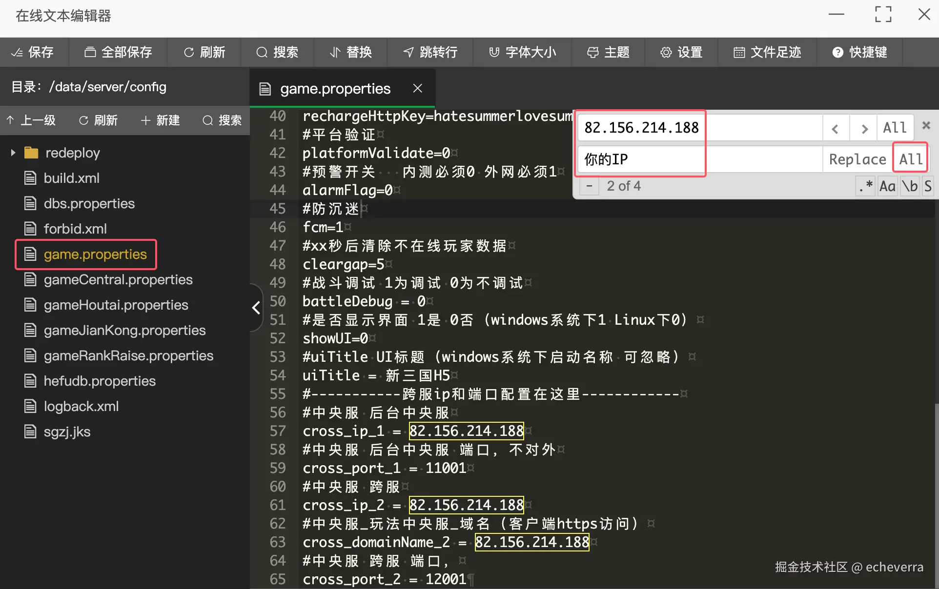 在宝塔中找到对应文件,Ctrl+F批量替换 IP 即可。以第一个game.properties为例。