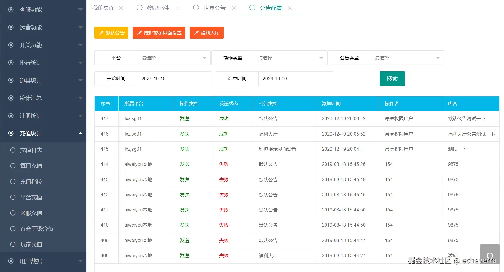 游戏经过一段时间的测试,发现 GM 后台会失效,玩家无法接收到后台邮件,调试了好久也没有解决- -,无奈只能选择充值后台:http://IP:81/cz,直接修改数据库对应账号的元宝和同比数值,只是游戏中的首充就无法完成了,不过到并没有什么大的影响。充值后台界面我进行了优化,有需要的可以找我要哈~
