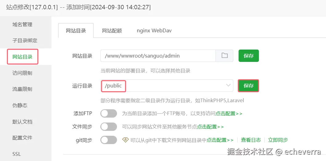 修改运营站点,运行目录选择 public,保存。