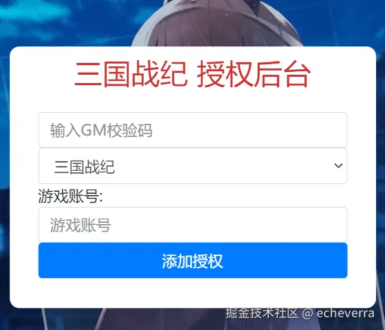 游戏 GM 授权后台链接:http://IP:81/gm/gm.php,默认 GM 码是123456,输入 GM 码和玩家账号就可以添加授权。如果想修改 GM 码,可以修改文件/www/wwwroot/sanguo/gm/user/config.php中gmcode字段值即可。