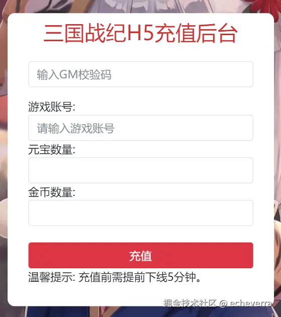 游戏还有一个小充值后台,无需 GM 码,需要先下线,链接:http://IP:81/cz,经测试也是可用的。