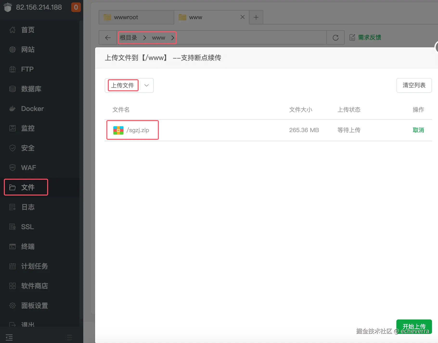 拿到源码后,将sgzj.zip压缩文件通过宝塔上传到根目录,由于最新的宝塔禁止直接上传到根目录,可以先上传到任一目录下,在剪切粘贴到根目录。