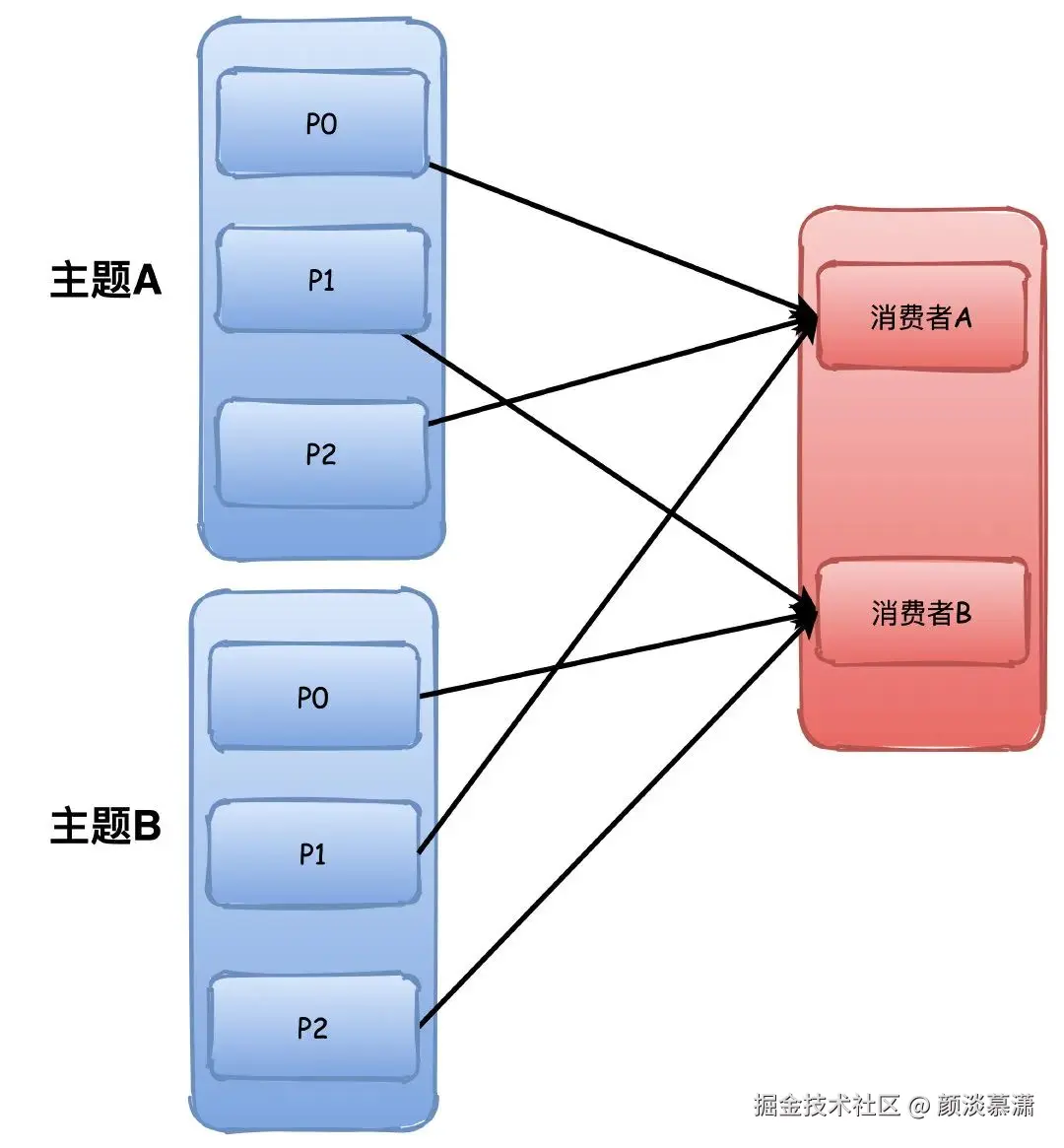 比如下图中两个主题的P0\P1都被分配给了A,这样A有4个分区,而B只有2个,如果这样的主题数量越多,那么不均衡就越严重。