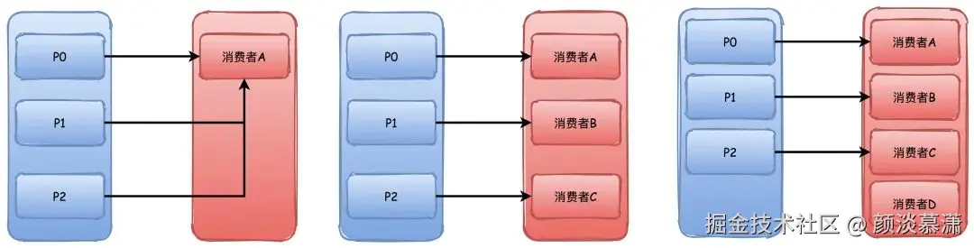 比如有3个分区,消费者A排序更靠前,所以能够分配到P0\P1两个分区,消费者B就只能分配到一个P2。
