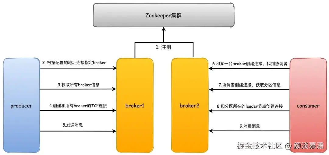 1.首先kafka broker启动的时候,会去向Zookeeper注册自己的ID(创建临时节点),这个ID可以配置也可以自动生成,同时会去订阅Zookeeper的brokers/ids路径,当有新的broker加入或者退出时,可以得到当前所有broker信息