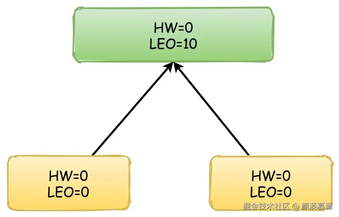 首先,生产者不停地向Leader写入数据,这时候Leader的LEO可能已经达到了10,但是HW依然是0,两个Follower向Leader请求同步数据,他们的值都是0。
