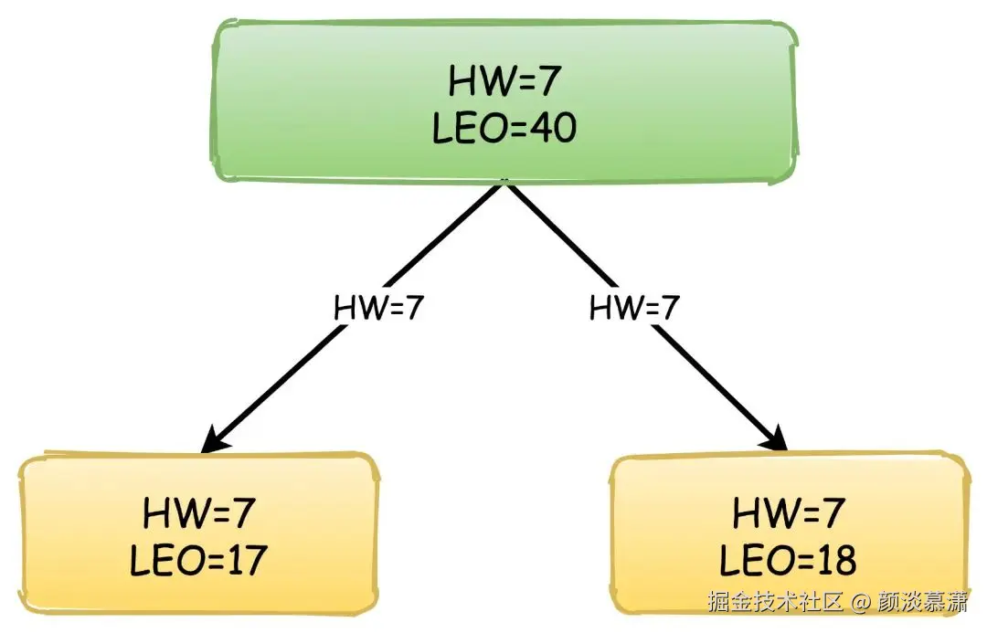 然后,消息还在继续写入,Leader的LEO值又发生了变化,两个Follower也各自拉取到了自己的消息,于是更新自己的LEO值,但是这时候Leader的HW依然没有改变。