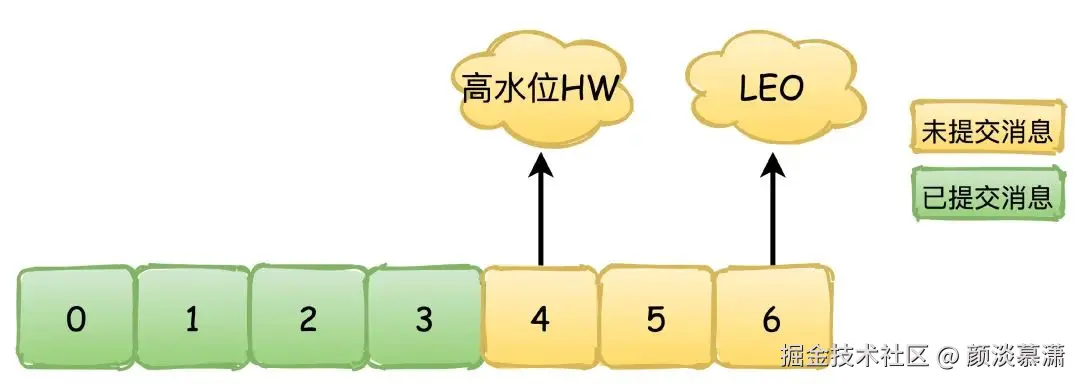 **HW(High Watermark):**高水位,也叫做复制点,表示副本间同步的位置。如下图所示,04绿色表示已经提交的消息,这些消息已经在副本之间进行同步,消费者可以看见这些消息并且进行消费,46黄色的则是表示未提交的消息,可能还没有在副本间同步,这些消息对于消费者是不可见的。