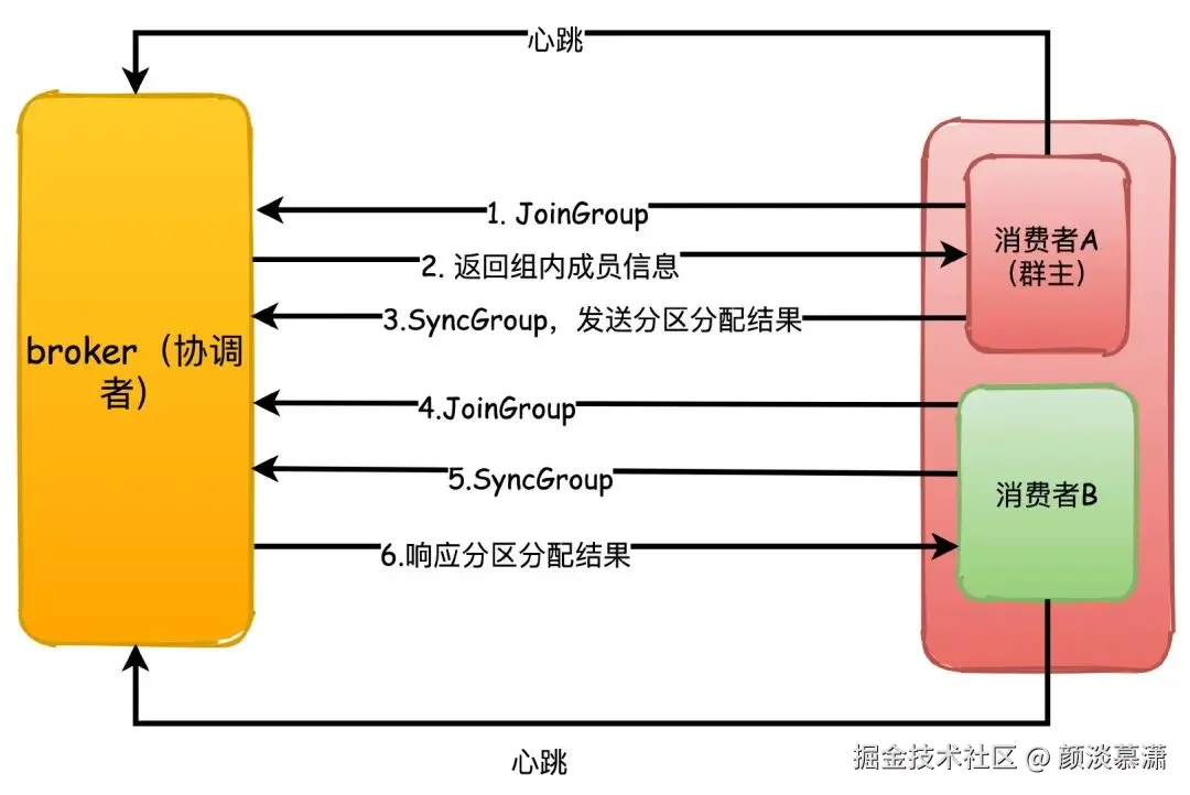 1.每个消费者第一次加入组的时候都会向协调者发送JoinGroup请求,第一个发送这个请求的消费者会成为“群主”,协调者会返回组成员列表给群主
