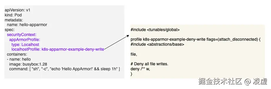 上图右侧 AppArmor 的配置文件有自己特定的规则,所以看上去有点奇怪。