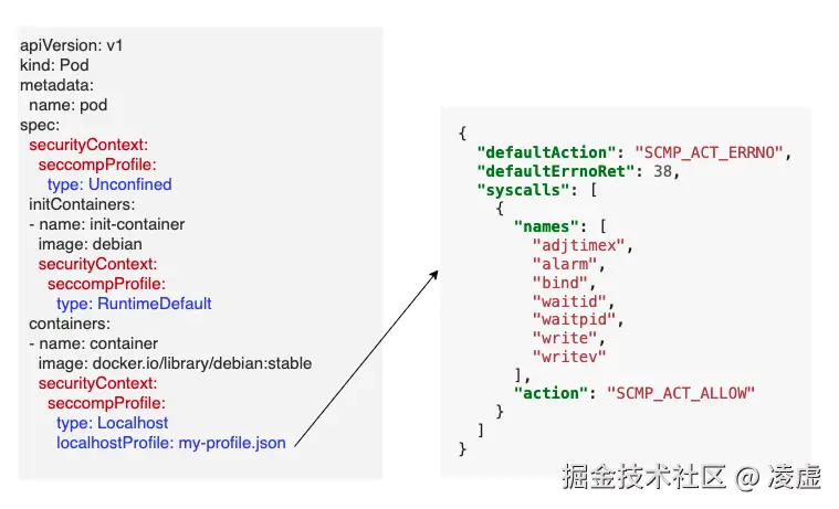 Unconfined:无限制。RuntimeDefault:使用容器运行时(如 containerd / CRI-O)的默认配置。Localhost:使用节点本地的配置文件。
