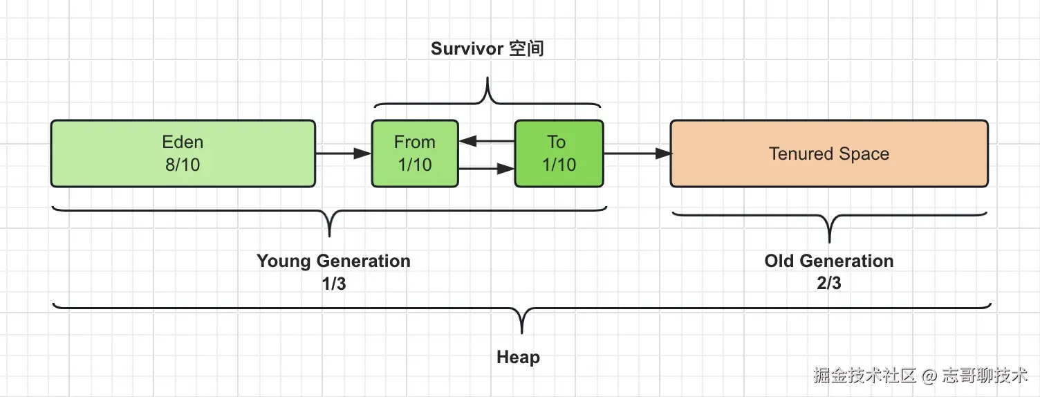 在虚拟机中,堆被划分成两个不同的区域:年轻代 (Young Generation) 和老年代 (Old Generation),默认情况下按照1 : 2的比例来分配空间。