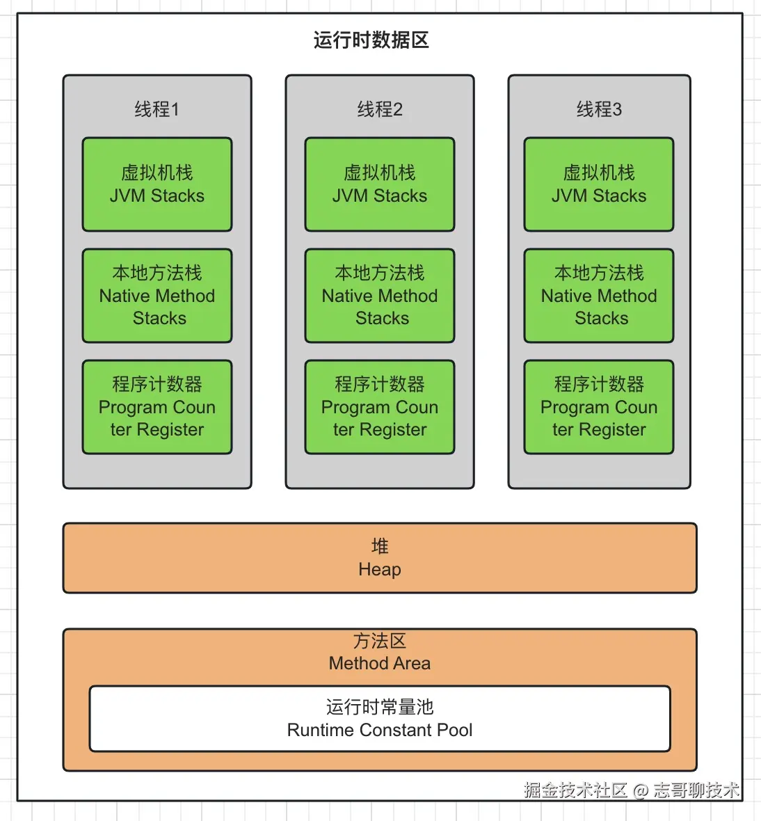 其中,运行时数据区的程序计数器、虚拟机栈、本地方法栈属于每个线程私有的区域;堆和方法区属于所有线程间共享的区域。