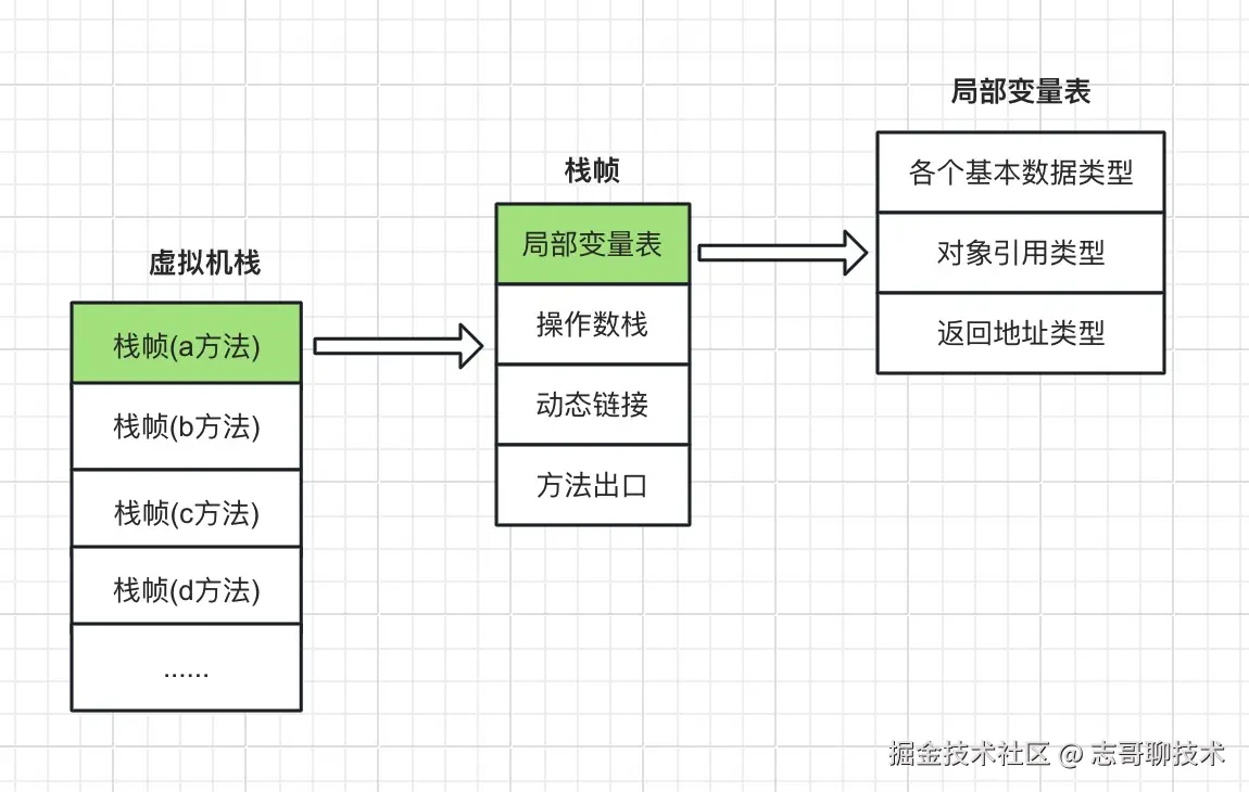 虚拟机栈描述的是 Java 方法执行时的内存模型,每个方法执行的时候都会创建一个栈帧(Stack Frame), 用于存储局部变量表、操作数栈、动态链接、方法出口和一些额外的附加信息。每一个方法从被调用直到执行完成的过程,就对应着一个栈帧在虚拟机栈中从入栈到出栈的全过程。