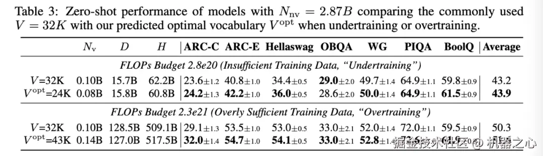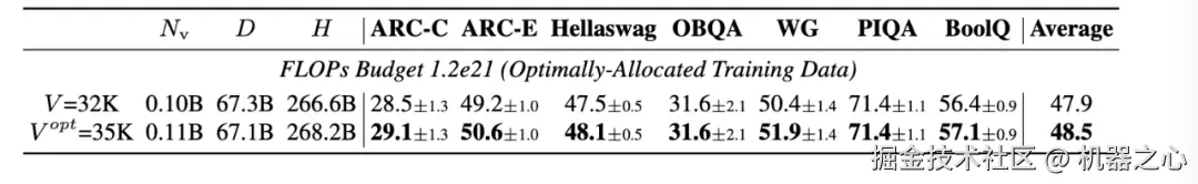 为了验证这些预测,本文在 3B 参数的模型上进行了实验,这些模型在不同的 FLOPs 预算下进行了训练。实验中,本文比较了使用常规词表大小(例如 32K)与使用预测的最优词表大小的模型性能。性能通过多个下游任务进行评估,包括 ARC-Challenge、Hellaswag 等。实验结果表明,使用预测的最优词表大小的模型在多个任务上一致地优于使用常规词表大小的模型。