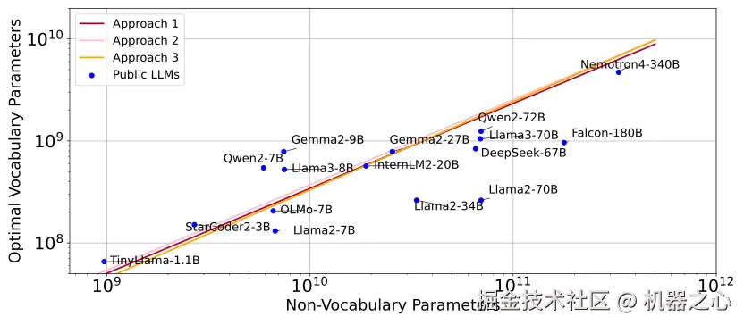 值得注意的是,主流 LLMs 通常分配给词表参数偏少。然而,学界和工业界已经开始转向更大的词表大小。例如 Llama3 的词表大小从 Llama2 的 32K 增加到 128K。然而,扩展数据仍然是最关键的部分,解决数据稀缺问题应成为未来工作的重点。